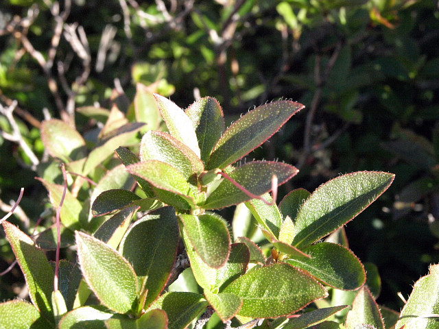 표면에 인편이 약간 있고 뒷면에 인편이 밀생하며 잎에 털이 있다. 엽병은 길이 6-10mm이다.