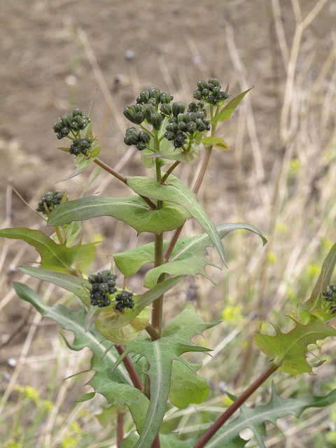 윗부분의 잎은 갈라지지 않으며 작고 밋밋하거나 잔톱니가 있다.