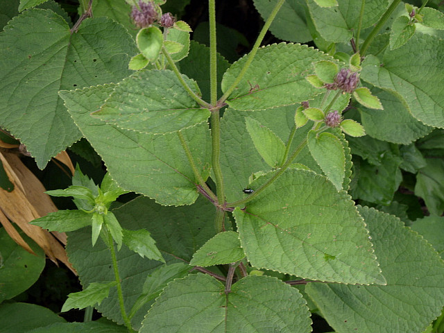 잎은 대생하고 엽병이 길며 심장상 난형이고 끝이 뾰족하며
