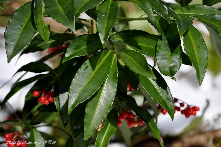왕백량금, 자금우, 산호수는 같은 자금우과로 우리 나라에는 제주도 산록에 서식하고 있다.