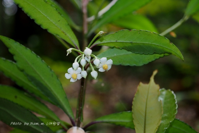 | 잎은 어긋나고 긴 타원형이며 내곡형 얕은 거치가 있고 두꺼우며 짙은 초록빛으로서 윤이 난다. 길이 7~12cm, 폭 2~4cm, |
