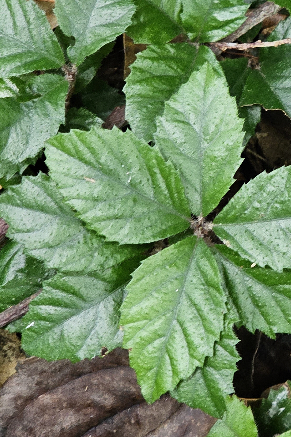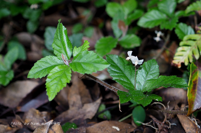 거의 돌려나는 잎, 양면에 누른 갈색털 많음, 큰 톱니가 드문드문, 잎자루에 황갈색 털, 잎길이 3~~4cm, 너비 1.5~3.0cm |