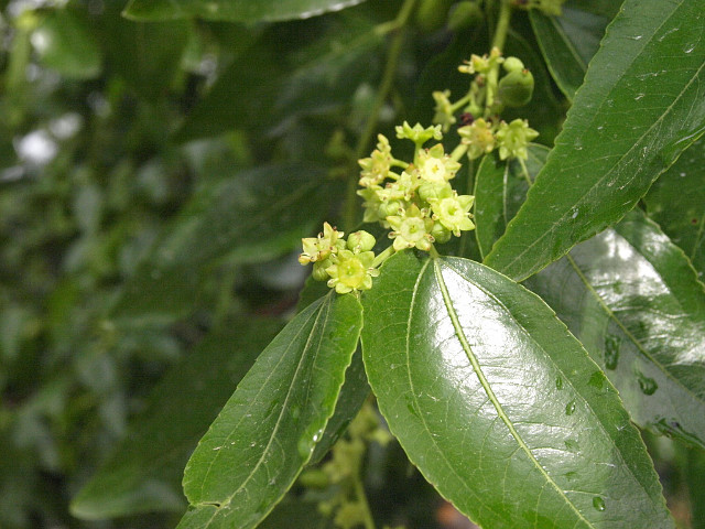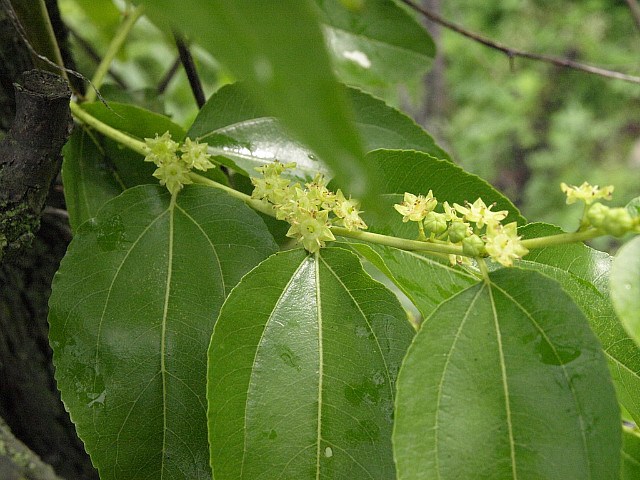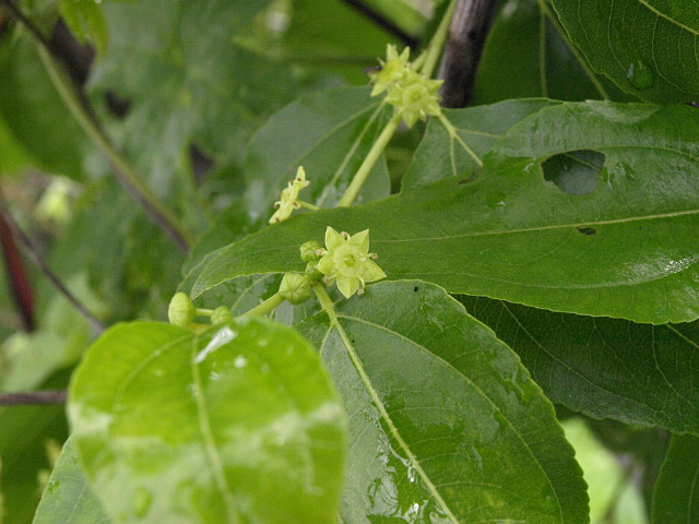 꽃은 연한 녹색의 양성화로 5-6월에 피며 지름 5-6mm이고 5수이며 연한 녹색이고