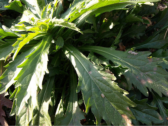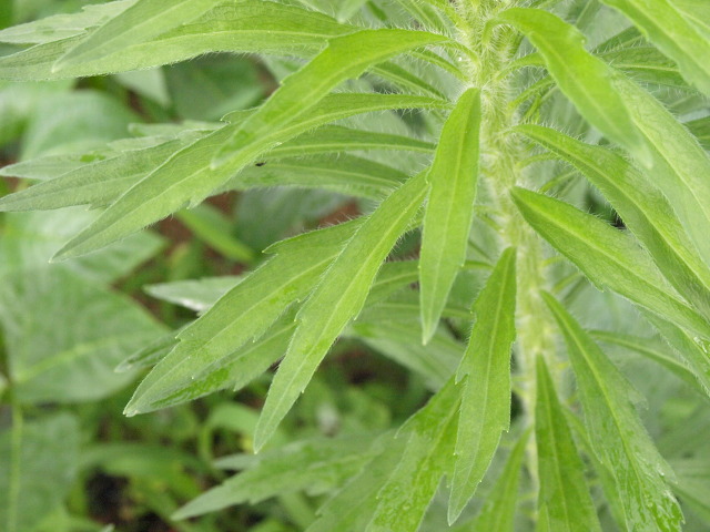 윗부분의 잎은 좁은 난형 또는 피침형으로서 뾰족한 톱니가 있고 양끝이 좁으며 뒷면 맥 위와 가장자리에 털이 있다.