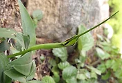 쥐방울덩굴이 전신주를 지탱하는 철사줄을 감아 오르고 있다.