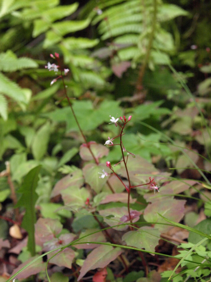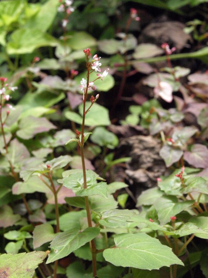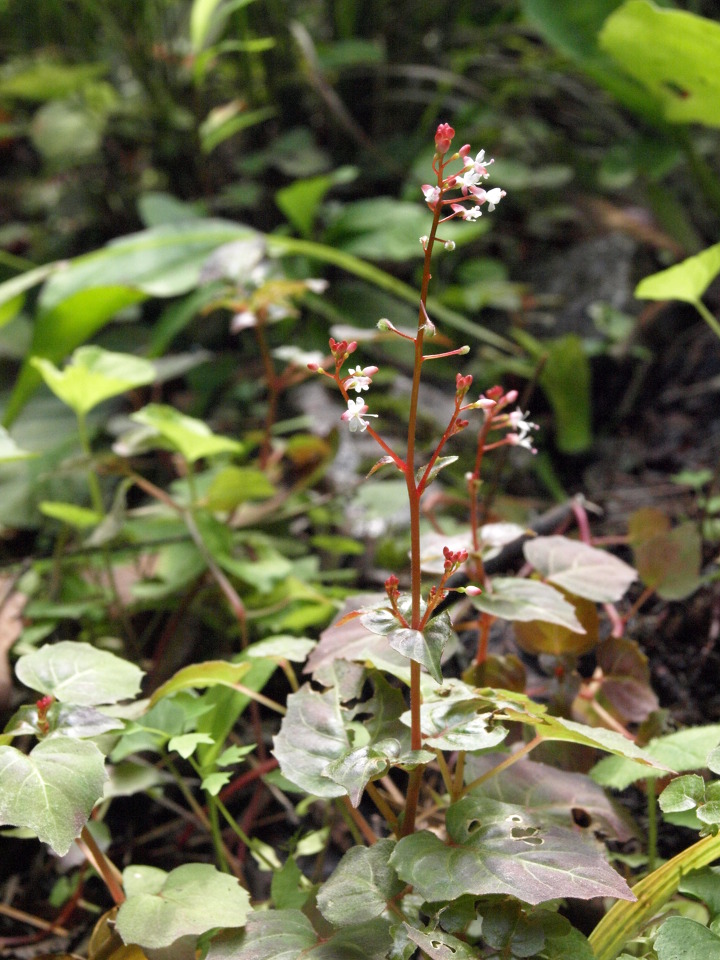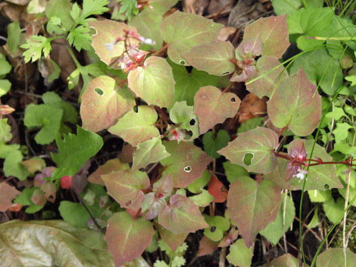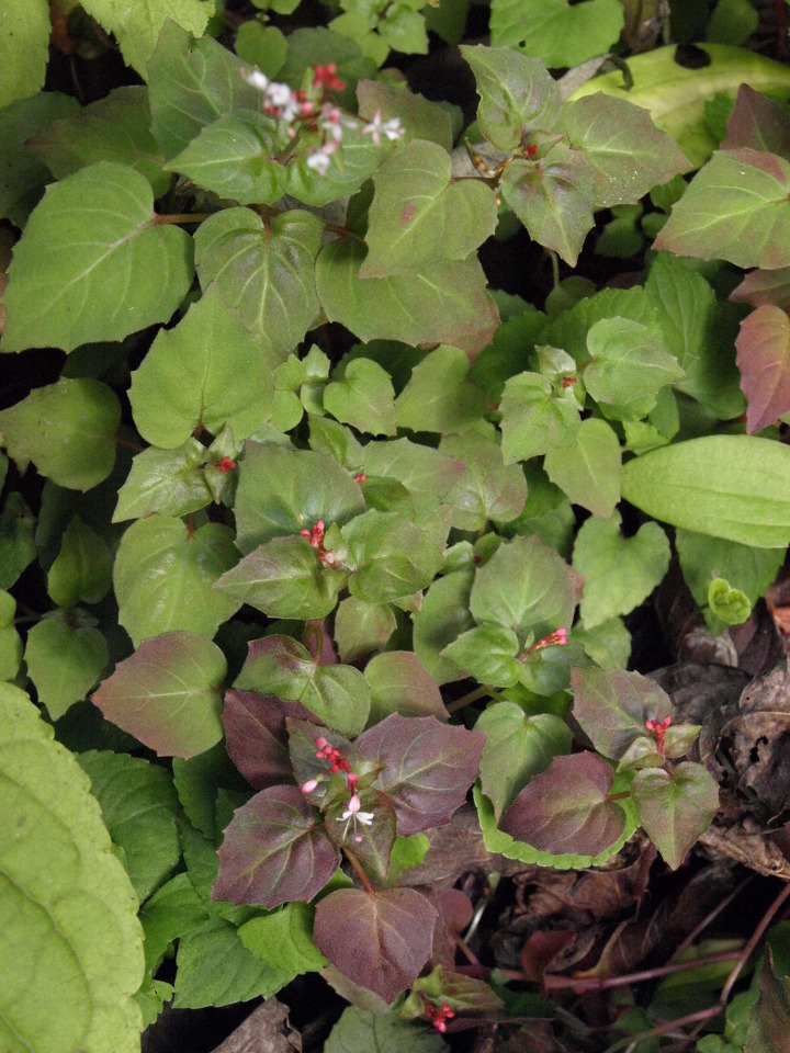 바늘꽃과 여러해살이풀. 깊은 산 응달진 습지에 자란다. 높이 5-15cm이고 줄기는 가늘며 곧게 서고 전체에 붉은 빛이 돌며 털이 없고 밑부분에서 실같은 포복지가 자라며 그 끝에 월동아가 생긴다.잎은 대생하고 삼각상 심장형 또는 난형이며 밑부분이 얕은 심장저이거나 심장저 비슷하고 표면과 가장자리에 잔털이 있고 뾰족한 톱니가 약간 있으며 엽병은 길이 1-2cm로서 날개가 있고 붉은빛이 돈다. 꽃은 7-8월에 피고 홍백색이며 줄기나 가지 끝의 총상화서에 달리고 화서는 꽃이 진 다음 자라서 길이 3-5cm로 되며 털이 없다. 꽃받침잎은 2개이고 붉은 빛이 돌며 꽃잎도 2개로서 도란형이고 끝이 오목하며 희고 꽃받침보다 다소 짧으며 수술은 2개, 암술은 1개이고 자방은 하위로서 갈고리같은 털로 덮였다.