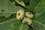 열매는 꽃이 핀 다음해 10월에 견과(堅果)로 익는데,견과는 둥글고 지름 2cm정도로서 다갈색이다.