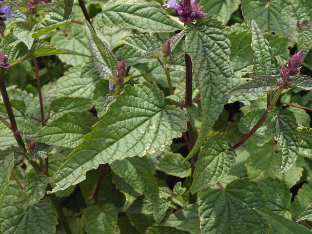 잎은 대생하고 길이가 5-10cm, 나비 3-7cm로 난상 심장형이며 끝이 뾰족하고 밑부분이 원저 또는 아심장저이며