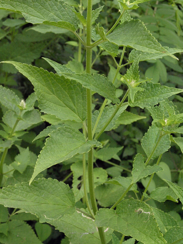 잎은 대생하고 길이가 5-10cm, 나비 3-7cm로 난상 심장형이며 끝이 뾰족하고 밑부분이 원저 또는 아심장저이며