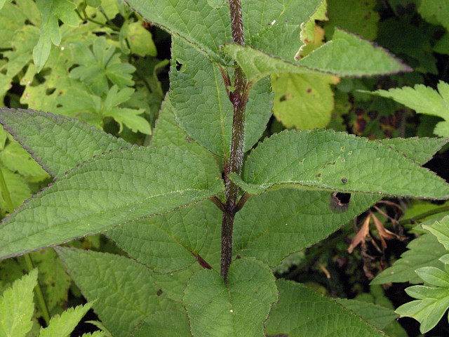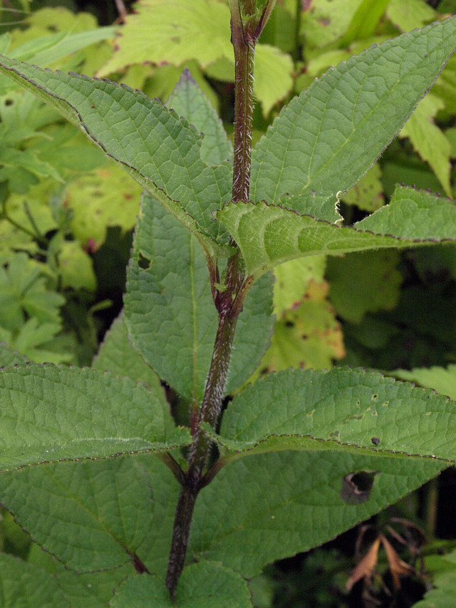 가장자리에 잘고 뾰족한 톱니가 있다. 잎과 엽병, 원줄기에 털이 밀생한다.