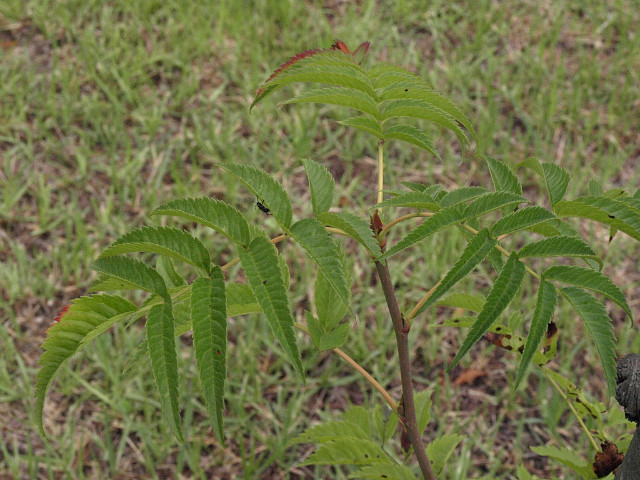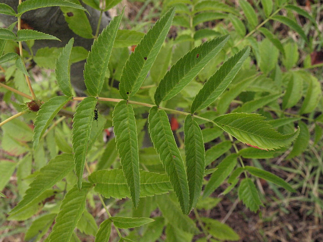 잎은 호생하고 기수우상복엽이며 소엽은 9-13개이고 피침형, 넓은 피침형 또는 타원상 피침형이며