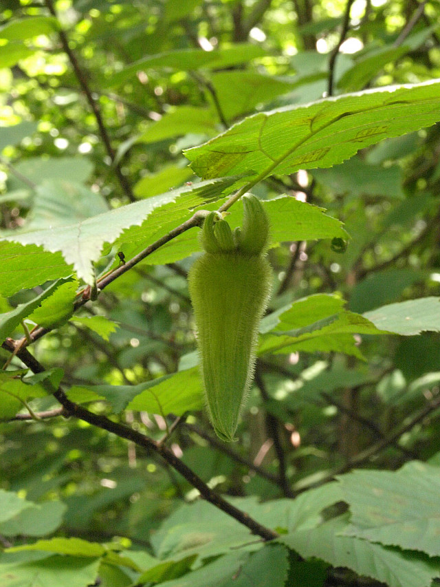 고운사의 물개암나무는 열매를 싸고 있는 길쭉한 포의 끝이 뾰족하게 오므라져 있다.