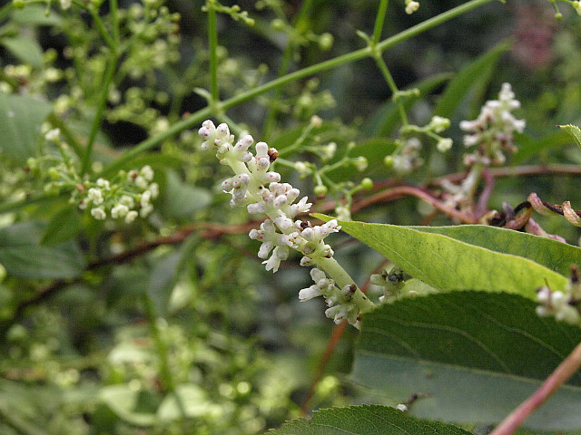 8,9월 경에 줄기 위에 짧은 이삭으로 백색의 잔꽃이 모여서 핀다.