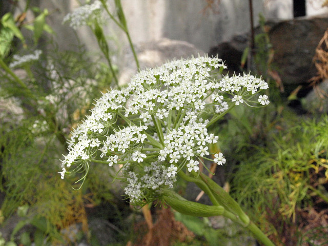 | 꽃 | 꽃은 8-9월에 피며 원줄기 끝과 가지끝의 큰 산형화서에 달리고 총산경은 15-20개, 소화경은 20-22개이다. 포엽은 0-2개로서 총산경보다 짧으며 피침형이고 소포는 1-5개가 소화경보다 길며 꽃받침잎은 절두로서 밋밋하고 꽃잎은 5개로서 도란형이며 안으로 굽고 백색이다. 자방은 타원형이며 길이 0.5-1.5mm로서 녹색이고 수술은 5개이며 꽃밥은 자주색이다. | 꽃은 7∼8월에 백색으로 피고 가지와 줄기 끝에 복산형화서로 달리며 총산경이 10개 미만.화경은 길고 능선이 있으며 총포는 1~2개로 선형이며 소총포는 수개이고 선형이다. 꽃은 5수성이고 자방하위이다. |