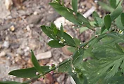 중앙부의 잎은 5개로 중열되며 열편은 능형으로서 서로 겹치고 가장자리에 치아상의 톱니가 있으며