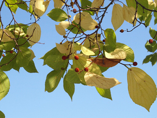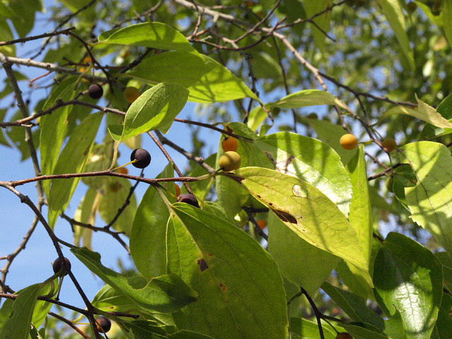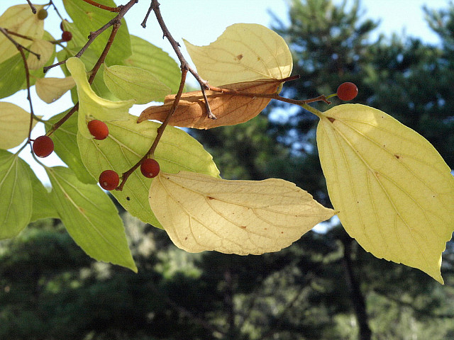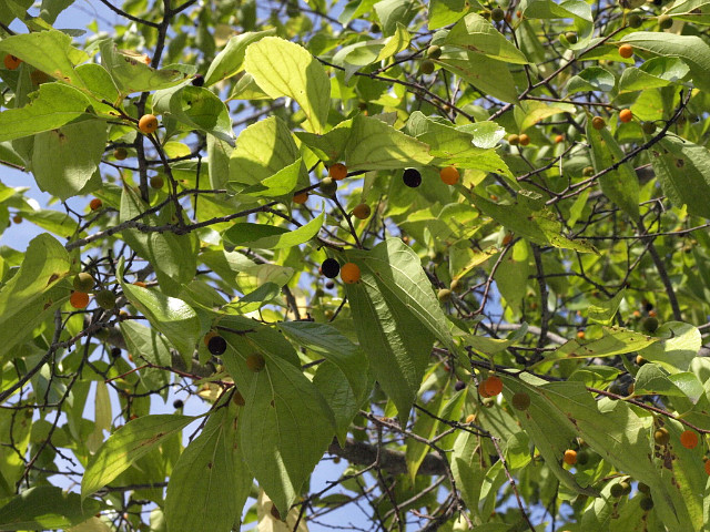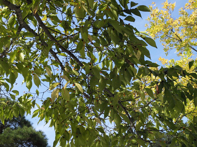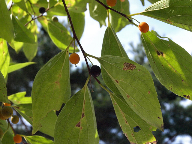 열매는 핵과로 둥글며 지름 6-7mm로서 10월에 주황색-검은색으로변하여 익는다