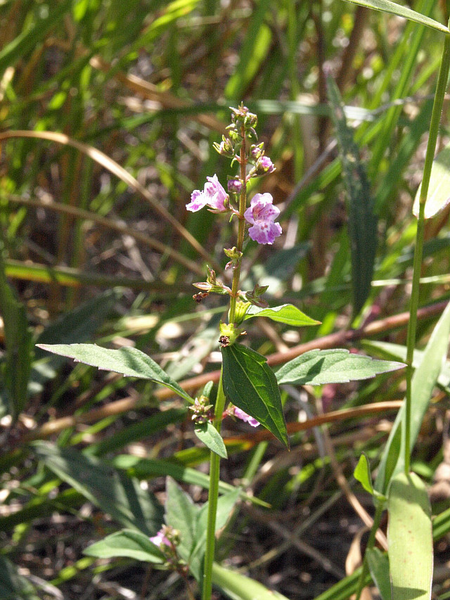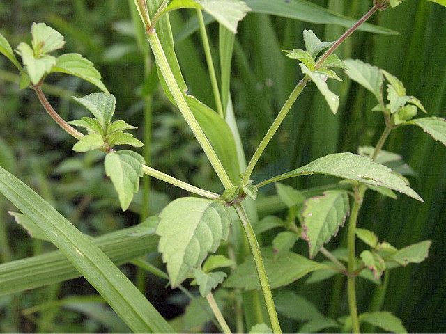 사각의 줄기 능상에 밑을 향한 짧은 털이 있고 마디에는 흰색 털.