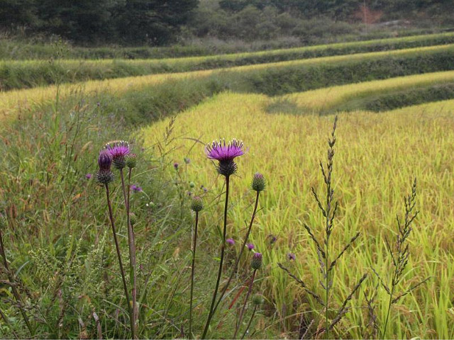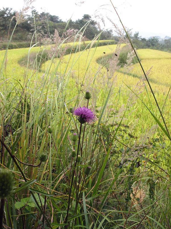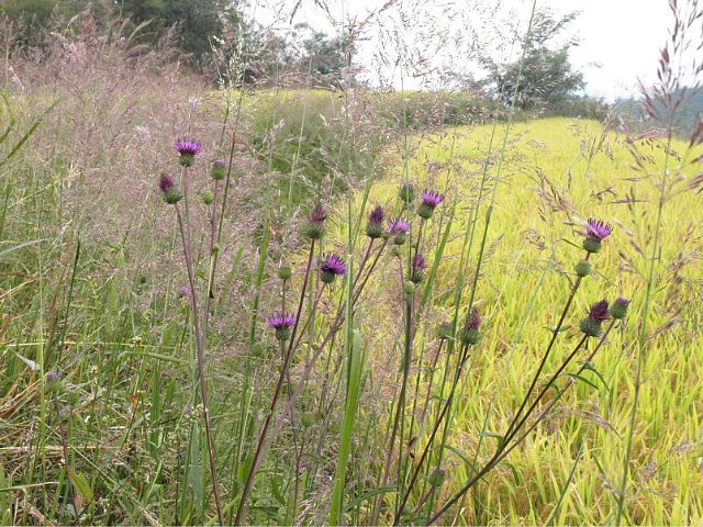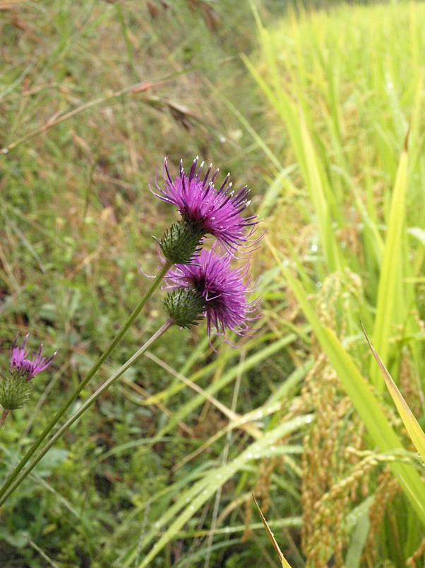벼가 노랗게 익고 있는 논을 배경으로 보라색 동래엉겅퀴가 참 잘 어울린다.