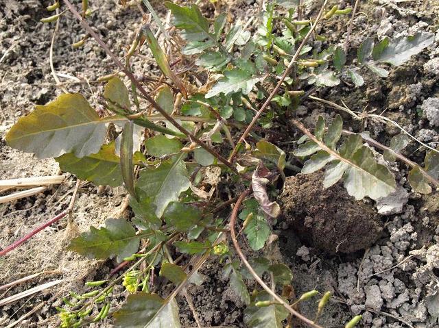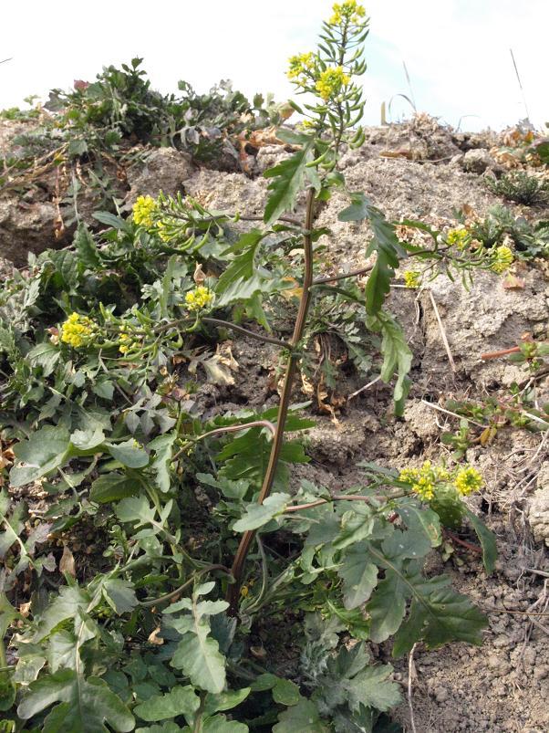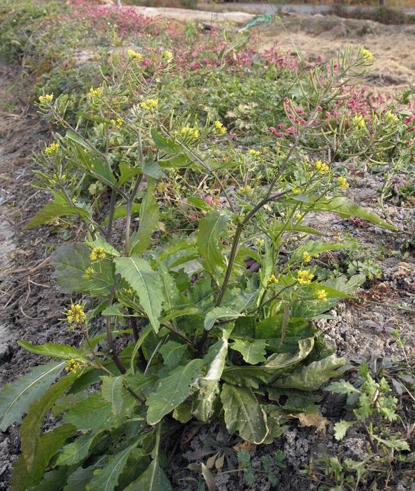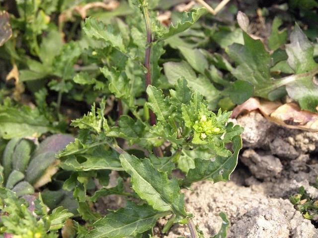 정열편이 가장 크며 가장자리에 결각상의 톱니가 있고 엽병 밑부분이 넓어져서 원줄기를 다소 감싼다. <좀개갓냉이>