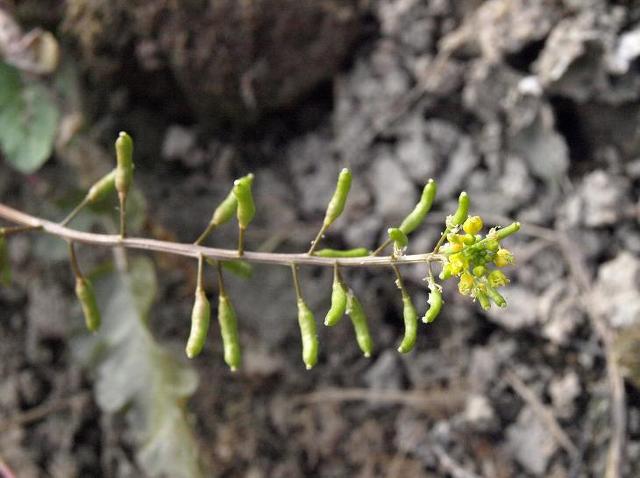 약간 옆으로 뻗는 길이 5-8mm의 대 위에 달리고 끝에 굵고 짧은 암술대가 있으며 종자는 황색이다..<개갓냉이>