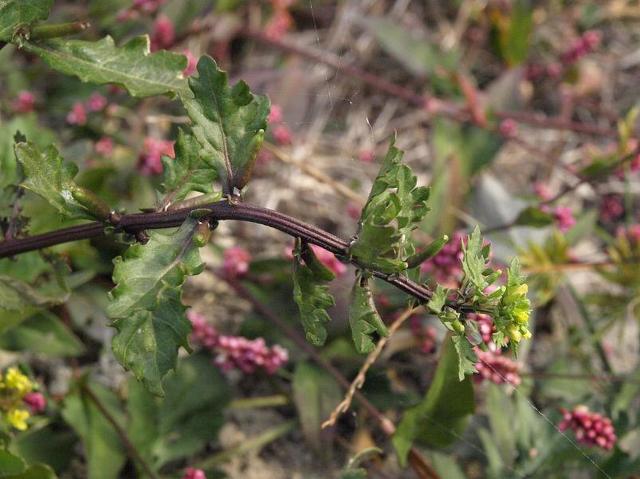 잎이 작고 짜박짜박한 느낌을 준다. 줄기 위쪽의 잎은 잎자루는 없고 결각상 톱니를 가지고 있다.