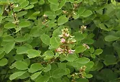 잎은 3출엽이며 난상 타원형이고 첨두이며 넓은 예저 또는 원저이고 길이 3-6cm 로서