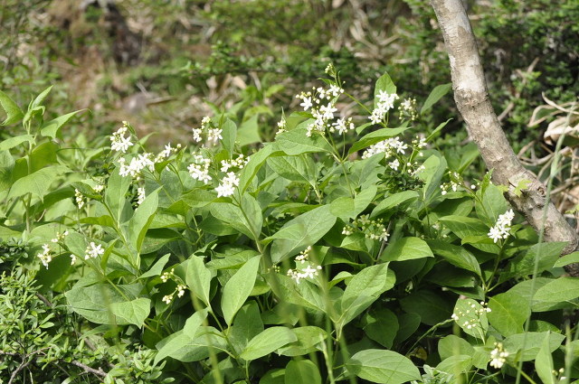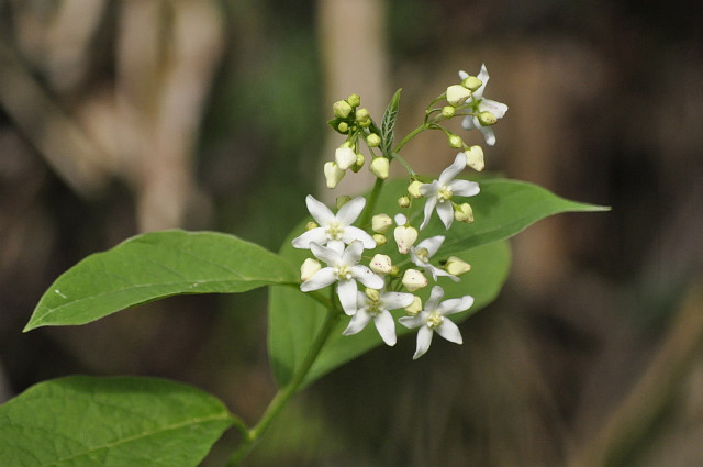 꽃받침은 녹색으로서 5개로 갈라지고 열편에 잔털이 있으며 화관은 백색이고 지름 2cm로서 5개로 갈라지며 열편은 좁은 난형이고