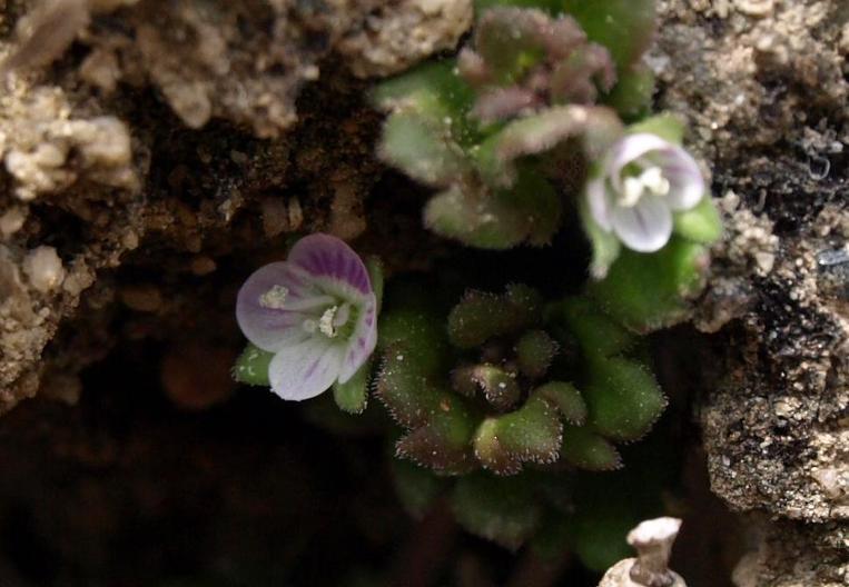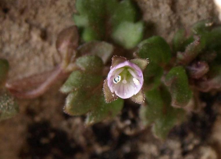 5~6월 담홍자색의 꽃이 잎겨드랑이에 1개씩 달린다. 가는 꽃대는 잎과 거의 같은 길이이고 화관은 지름이 3~4 밀리미터이며 통 부분이 짧다. 수술은 2개이고 암술대는 길이 1 밀리미터 정도이다. 꽃받침은 4개로 깊게 갈라지고, 꽃받침조각은 난형으로 끝이 둔하며 빛깔은 녹색이다. 열매는 콩팥 모양의 삭과이며 전면에 부드러운 털이 있다.<위키백과>
