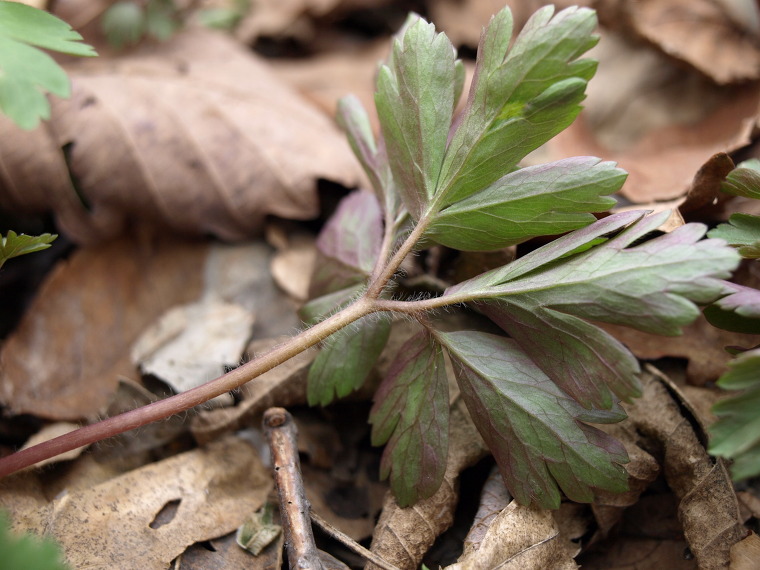 잎자루에 달린 잎은 3갈래로 갈라지고 갈래에는 불규칙한 큰톱니가 나 있다.