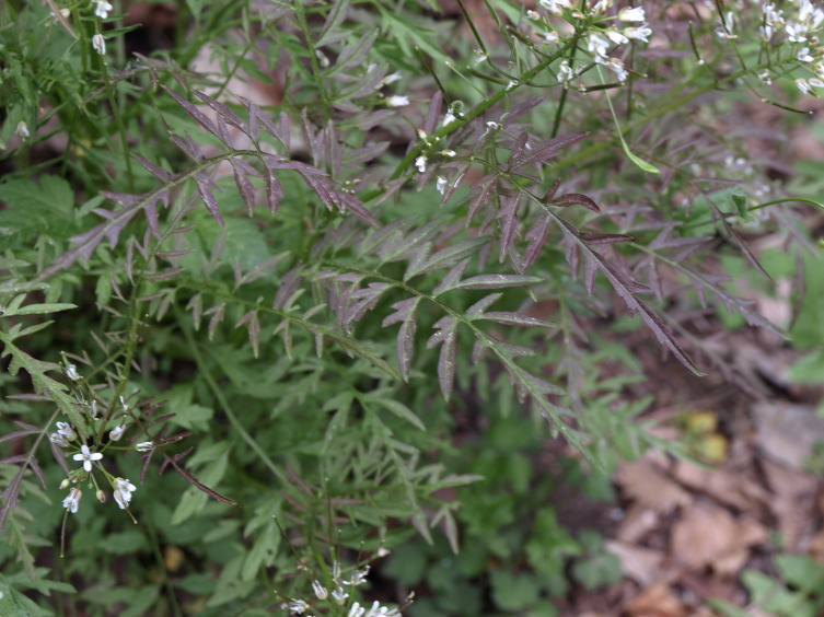 근생엽은 길이 10cm정도로서 우상으로 완전히 갈라지며 열편은 5-11개이고 가장자리가 2-3개의 둔한 톱니모양으로 갈라진다. 경생엽은 위로 갈수록 작아지지만 기수우상으로 갈라지는 것이 근생엽과 같으며 소엽이 다시 3-5개로 갈라진다.