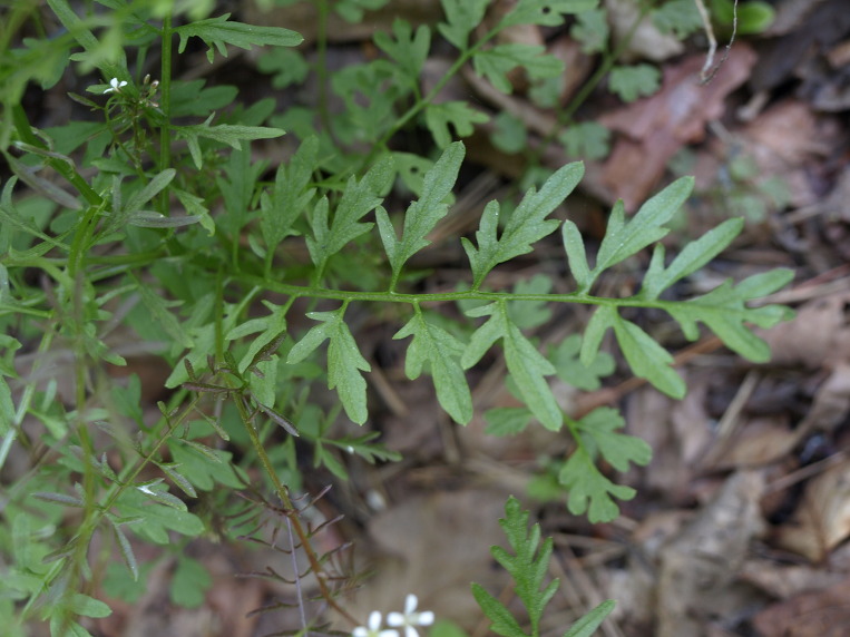 근생엽은 길이 10cm정도로서 우상으로 완전히 갈라지며 열편은 5-11개이고 가장자리가 2-3개의 둔한 톱니모양으로 갈라진다. 경 생엽은 위로 갈수록 작아지지만 기수우상으로 갈라지는 것이 근생엽과 같으며 소엽이 다시 3-5개로 갈라진다. 잎은 호생하고 엽병이 있다