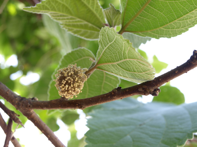 급하게 다가가니...와우~! 잎 겨드랑이에 개량 뽕나무 오디만한 수꽃이 달랑달랑 매달려 있다.