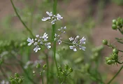 원추형의 취산화서에 많은 꽃이 달린다. 소화경은 가늘고 길며 화관의 지름은 1.2cm내외이다.