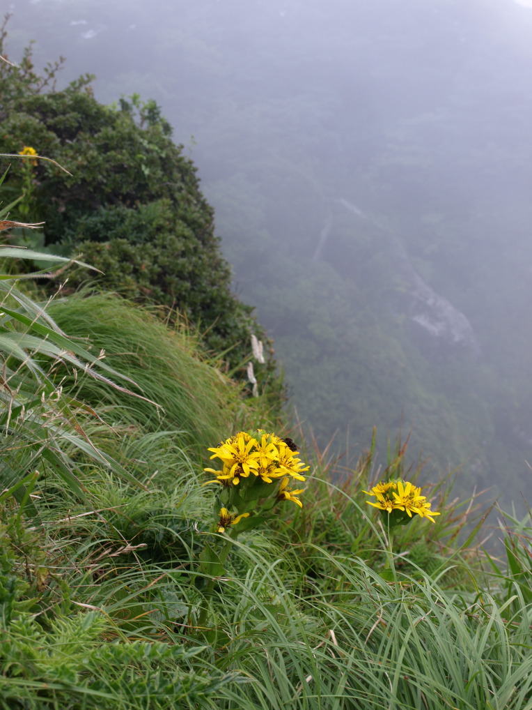 병풍바위 절벽 위 풀밭에 곰취가 노란 꽃방망이를 흔들고 있다.