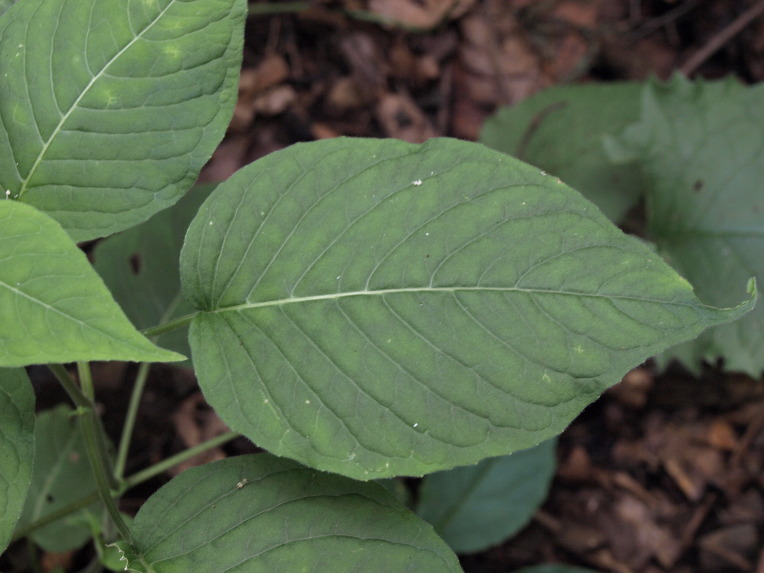 잎은 마주나며, 난상 심장형 또는 넓은 난형으로 밑부분이 원저 또는 얕은 심장저이다.