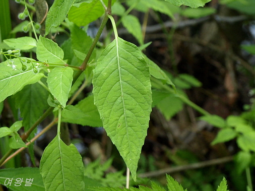 ![]() 넓은 피침형, 밑부분이 예저 또는 원저, 길이 5-10cm, 폭 2-3cm로서 끝이 뾰족하며 가는 털이 퍼져 나고 가장자리에 얕은 톱니 엽병은 길이 1-4cm로서 잔털이 있다. |