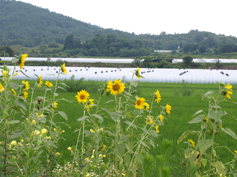 볏잎 푸른 여름들판을 지키는 해바라기가 곱다.