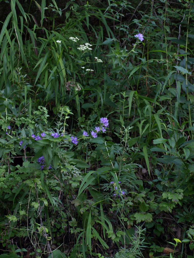 꽃은 7-8월에 피고 자주색으로서 원줄기 끝에 10개 정도가 두상으로 모여 위를 향해 달리지만 윗부분의 엽액에도 달리며 소화경이 없다.