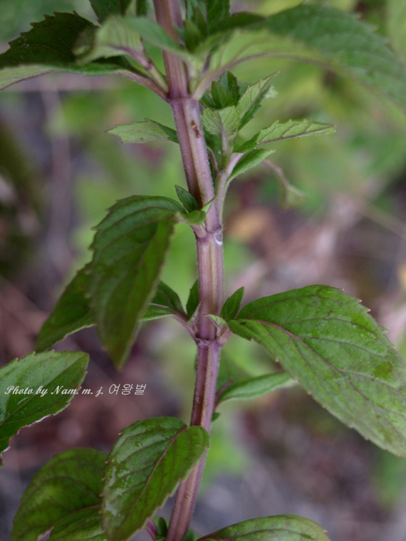 높이가 50cm에 달하고 둔한 사각이 지며 전체에 짧은 털이 나고 줄기는 곧게 서며 가지가 갈라진다.