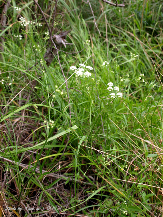 | 소산경은 길이 2cm로서 10개 정도이며 10-20개의 백색꽃이 달리고 소화경은 길이 3-5mm이다. | 총포는 5-6개로서 선형이며 젖혀지고 10-20개의 소산경으로 갈라지며 각 10여개의 꽃이 끝에 달린다. | 총포는 선형이며 3-5장이다.줄기는 서는 것과 눕는 것이 있으며 높이는 40-100cm이고 줄기는 가운데가 비어 있다. |