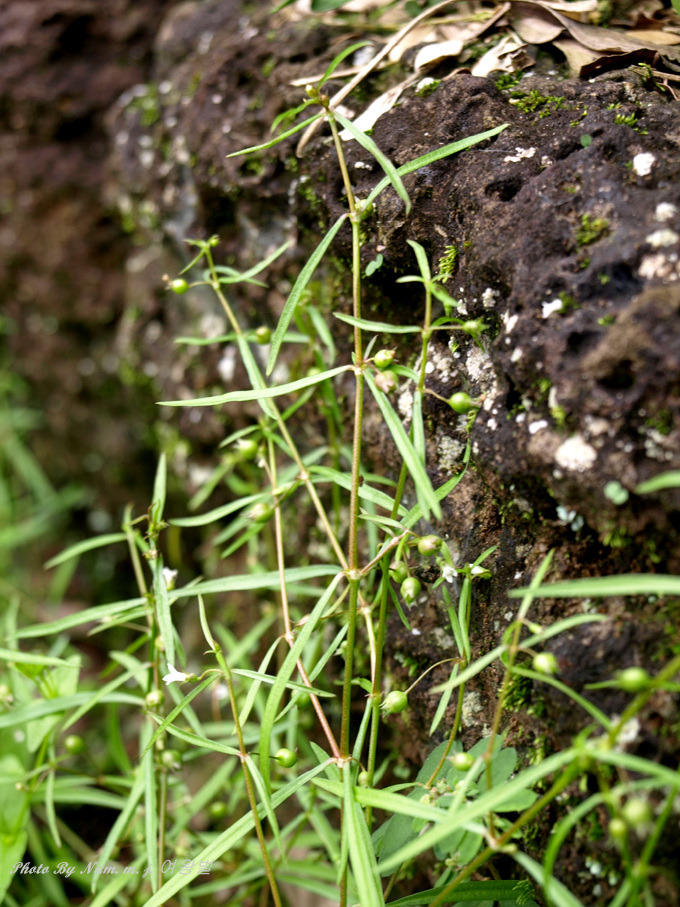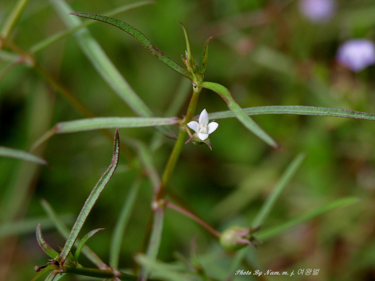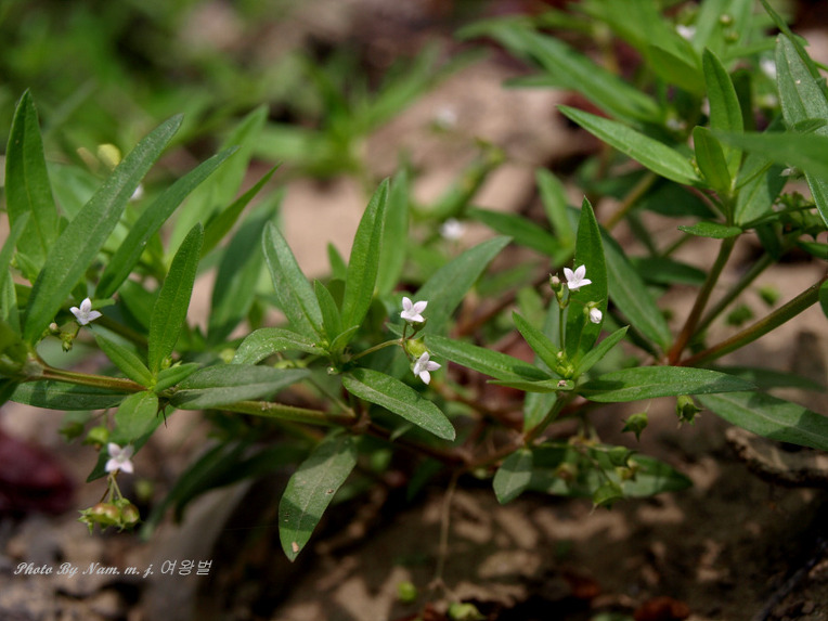 잎은 대생하며 양끝에 좁고 가장자리에 톱니가 없지만 깔깔하며 길이 1-3.5cm, 폭 1.5-3mm로서 주맥만이 나타난다