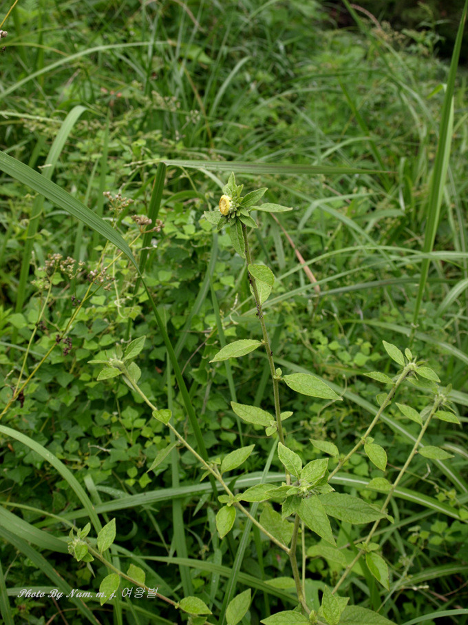 꽃은 두상화로 8-10월에 황색으로 피며 지름 6-8mm로서 가지 끝과 원줄기 끝에 밑을 향해 달려서 전체가 총상으로 된다. 총포는 난상 구형이고 길이 5-6mm 나비 6-8mm이며 포린은 4줄로 배열되고 바깥 것은 점차 짧아지고 넓은 난형으로서 첨두이고 중앙부의 것은 긴 타원형이며 원두이다. 근생엽은 꽃이 필 때쯤에 말라 없어진다. 밑부분의 잎은 엽병이 길며 난형 또는 난상 긴 타원형이고 예두 또는 둔두이며 원저 심장저 또는 넓은 예저이고 길이 7-23cm로서 양면에 털이 있으며 뒷면에 선점이 있고 가장자리에 불규칙한 톱니가 있으며 엽병 밑부분에 날개가 없다.중앙부의 잎은 긴 타원형으로서 밑으로 갈수록 좁아지지만 날개로 되지 않고 윗부분의 잎은 작으며 긴 타원형 또는 긴 타원상 피침형으로서 양끝이 좁고 엽병이 없다. 높이 25-150cm이고 전체에 가는 털이 밀생하며 곧게 서고 몇 개의 가지가 옆으로 퍼진다. |