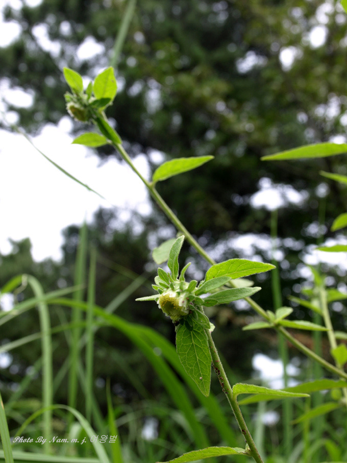 | 꽃은 8-9월에 피고 연한 녹색이며 지름 15-18mm로서 모두 관상화이고 줄기 끝과 원줄기 끝에 밑을 향한 두상화서로 달리며 화경이 길고 포엽은 많으며 길이 2-5cm로서 선상 피침형이다. 총포는 각두형(殼斗形)이고 길이 7-8mm로서 바깥 것은 잎 같으며 나비가 넓고 백색 털이 있으며 안쪽 것은 좁고 긴 타원형이며 둔두이다. 근생엽은 개화시기에 없어진다. 잎은 호생하며 밑부분의 것은 주걱 모양의 긴 타원형이고 둔두 또는 예두이며 길이 9-25cm 나비 4-6cm로서 밑부분이 좁아져서 엽병으로 흘러 날개로 되고 양면에 백색 털이 밀생하며 가장자리에 불규칙한 복거치 또는 파상의 톱니가 있다. 중앙부의 잎은 약간 작고 긴 타원형이며 둔두이거나 또는 긴 타원상 피침형으로서 양끝이 좁거나 둔하다. 높이 50-100cm이고 밑부분에 백색 털이 밀생하며 가지가 사방으로 퍼진다. |
