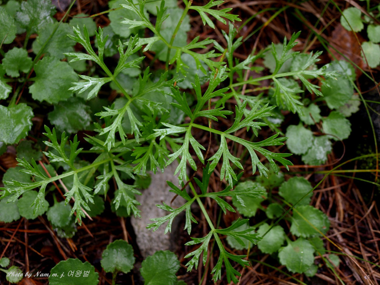 근생엽은 엽병이 길며 3회 우상으로 완전히 갈라지고 밑부분이 넓어져서 원줄기를 감싸며 첫째 우편은 길이 1mm정도의 엽병이 있거나 거의 없고 엽축에 접근하여 다시 2회 우상으로 갈라지기 때문에 첫째 열편이 우축(羽軸)에 붙어 있는 것 같다.