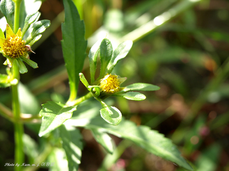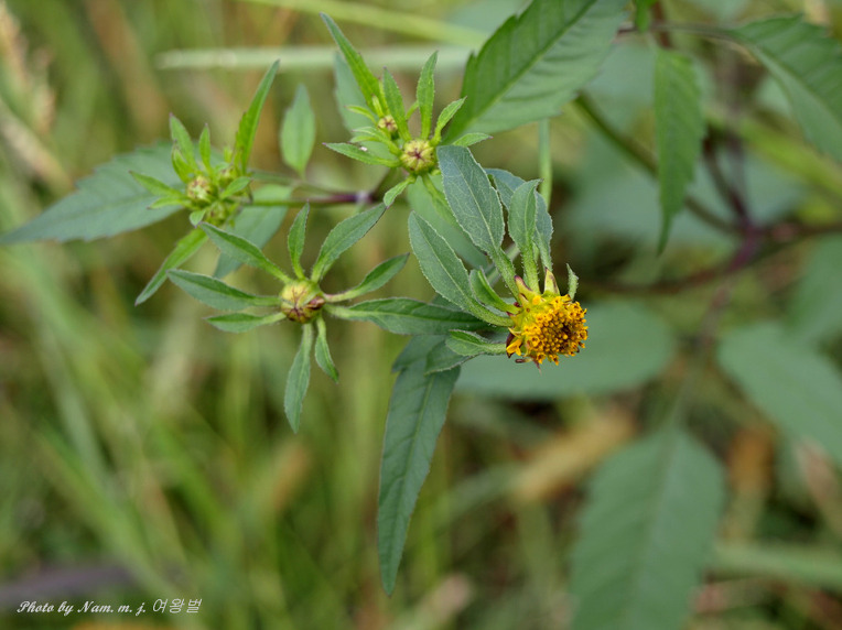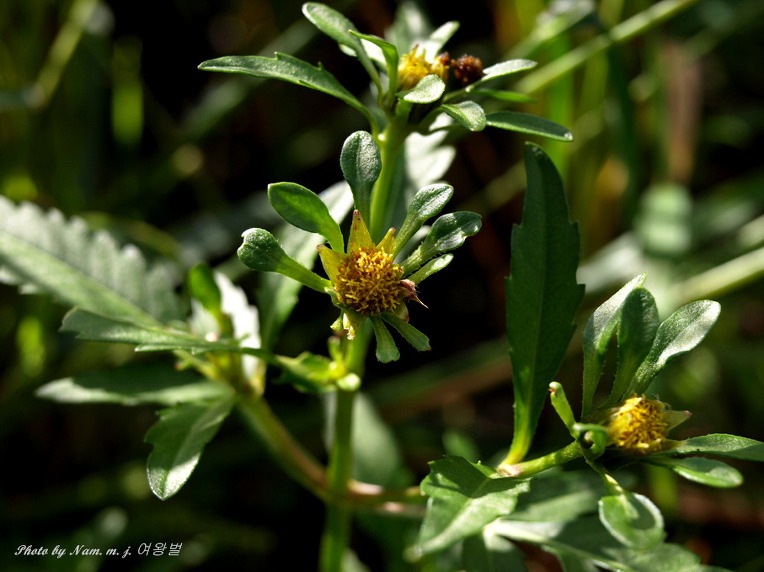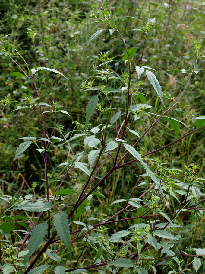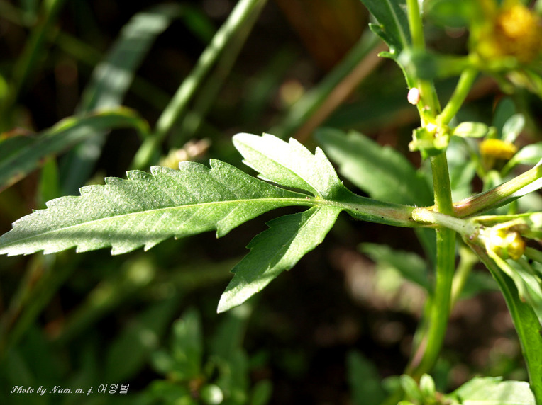 미국가막사리 : 잎이 3출엽으로 소엽이 있다,. 날개가 없고 줄기에 자색이 돈다. 간혹 2~3개의 혀꽃이 있다.