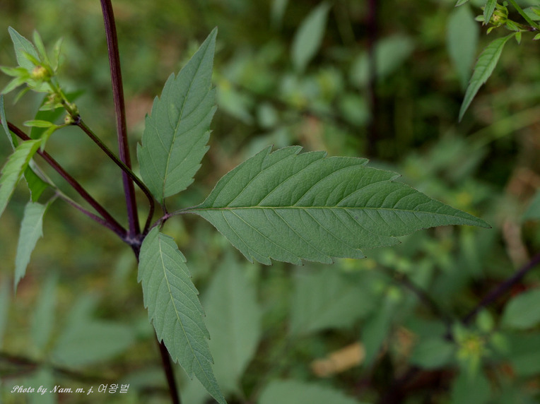미국가막사리 : 잎이 3출엽으로 소엽이 있다,. 날개가 없고 줄기에 자색이 돈다. 간혹 2~3개의 혀꽃이 있다.