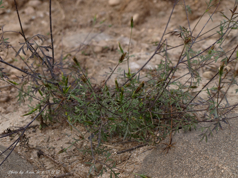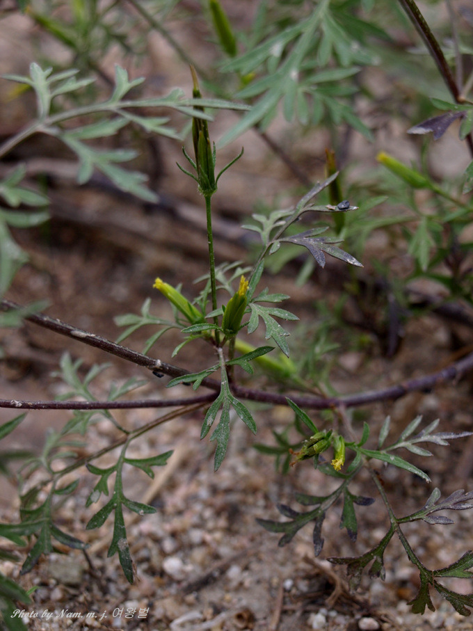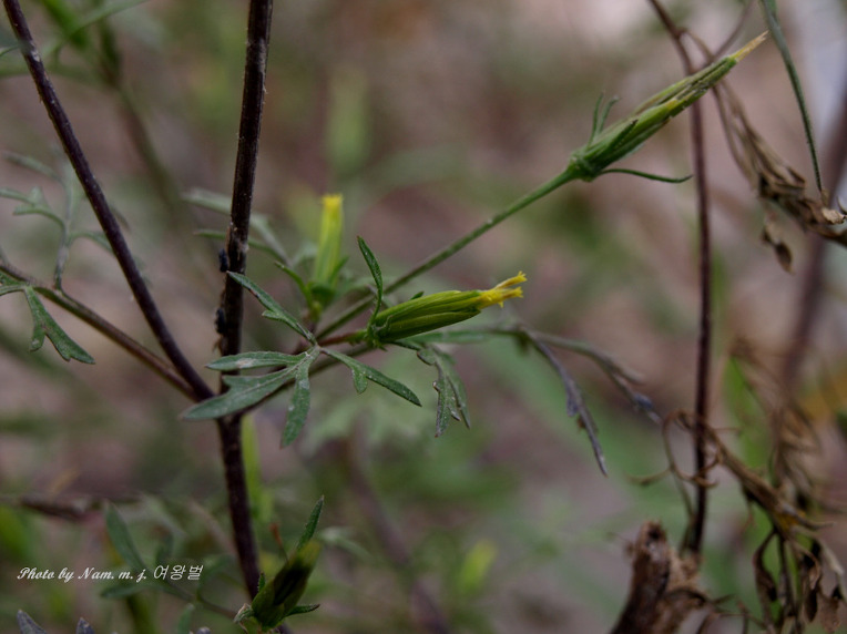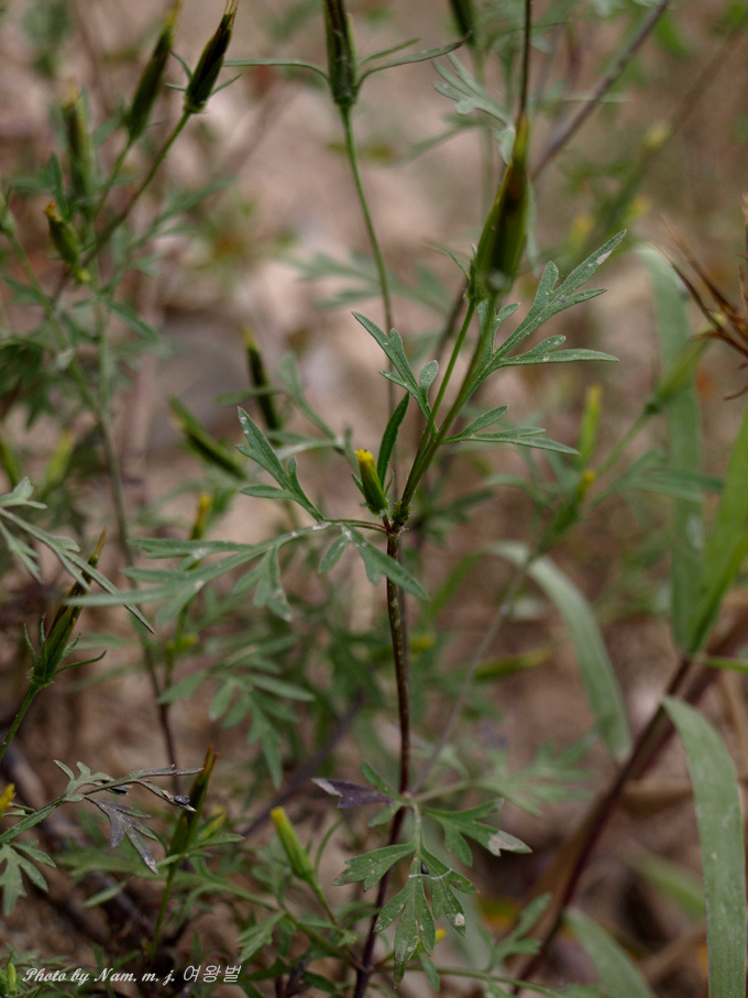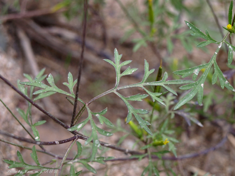 잎이 코스모스처럼 가늘게 깃꼴로 찢어져 있는데 꽃이 피기 전에는 얼핏 돼지풀로 혼돈할 수도 있다.
