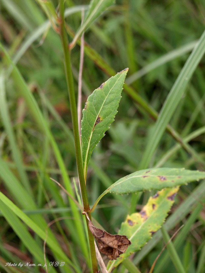 근엽은 엽병이 길고 원심형이나 화시에 없어지며 경엽은 3~5개씩 윤생 또는 호생하고 장 타원형, 난상 타원형 또는 선상 피침형으로
