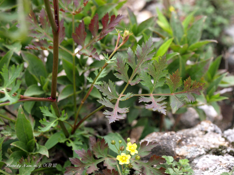 꽃잎은 5개이며 총포(總苞)도 여러 개이고 소총포는 6~8개이다. 5개의 수술이 있고 자방은 하위이다