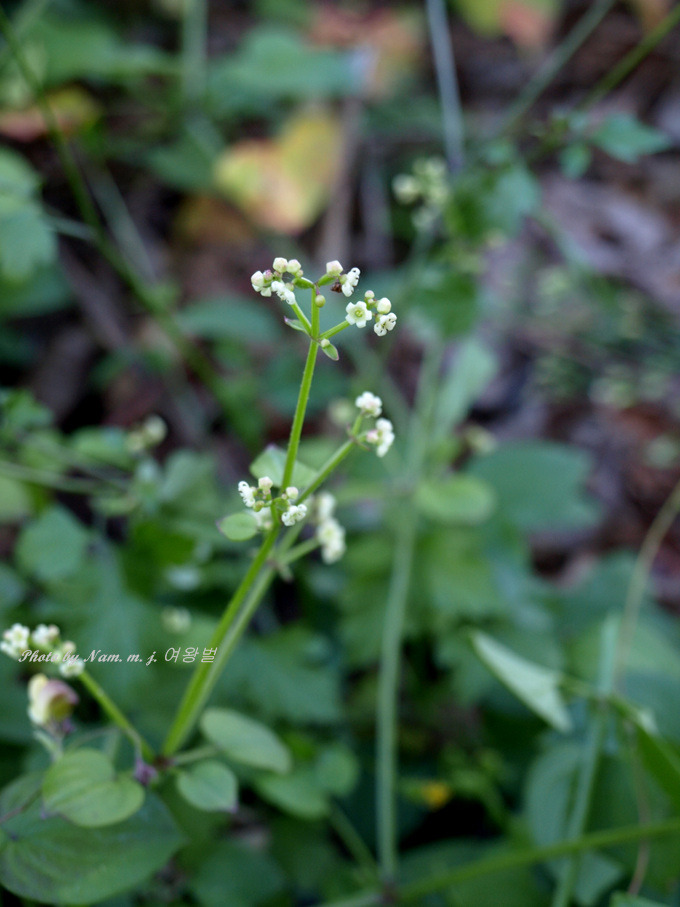 꽃은 7~8월에 피며 지름 3.5-4mm로서 4-5개로 갈라지고 연한 황색이며 엽액과 원줄기 끝의 원추화서에 달리고 소화경이 짧다. 잔꽃은 다수이며 포는 마주나고 심장형이다. 원줄기는 네모지며 능선에 밑을 향한 짧은 가시가 있다.